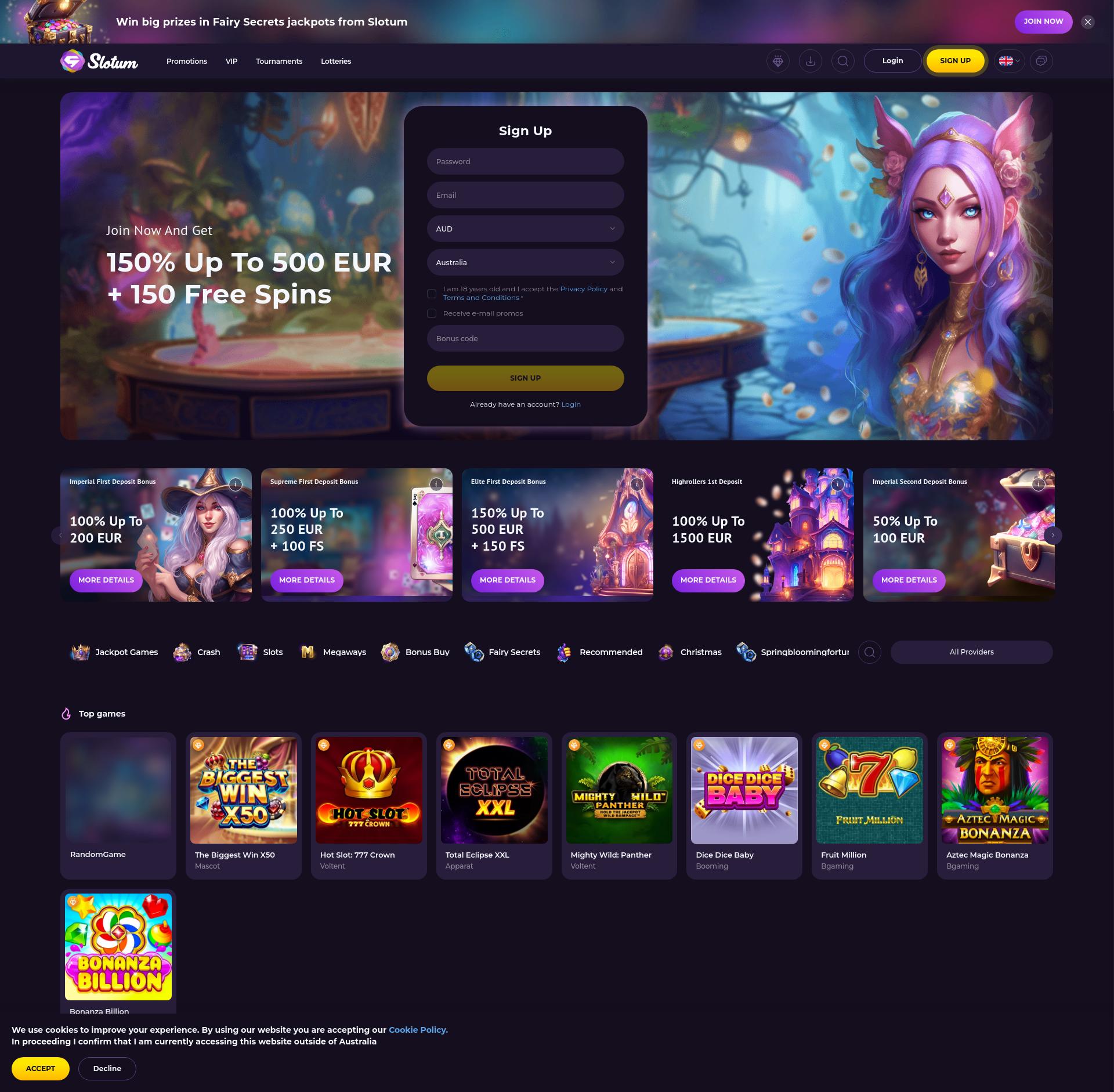 Slotum Casino je prvotřídní virtuální kasino, které slibuje zážitek blízký realitě. Je provozována renomovanou společností, proto jsou otázky spravedlnosti a bezpečnosti dobře postarány. Herní koš je plný nových a vzrušujících vydání od nejlepších vývojářů. S bonusem, který se snadno aktivuje, stojí za to vyzkoušet tento web.