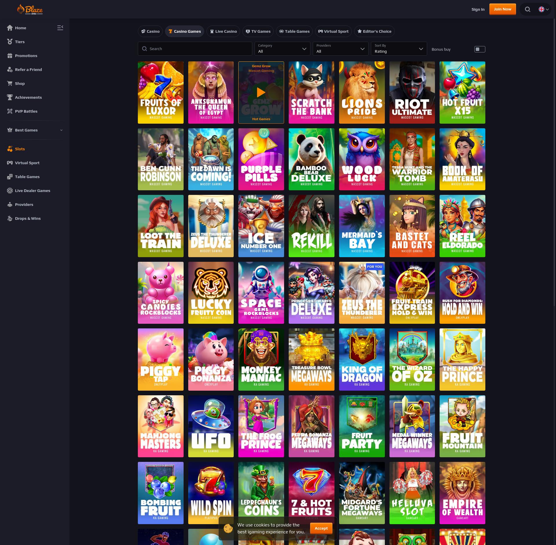 Hrajte 0 automatové hry od 0 poskytovatelů her v BlazeSpins kasinu. Přečtěte si naši recenzi BlazeSpins, abyste se dozvěděli více o bonusech a propagačních akcích BlazeSpins, bezplatných otočeních v kasinu BlazeSpins a mnohem více!