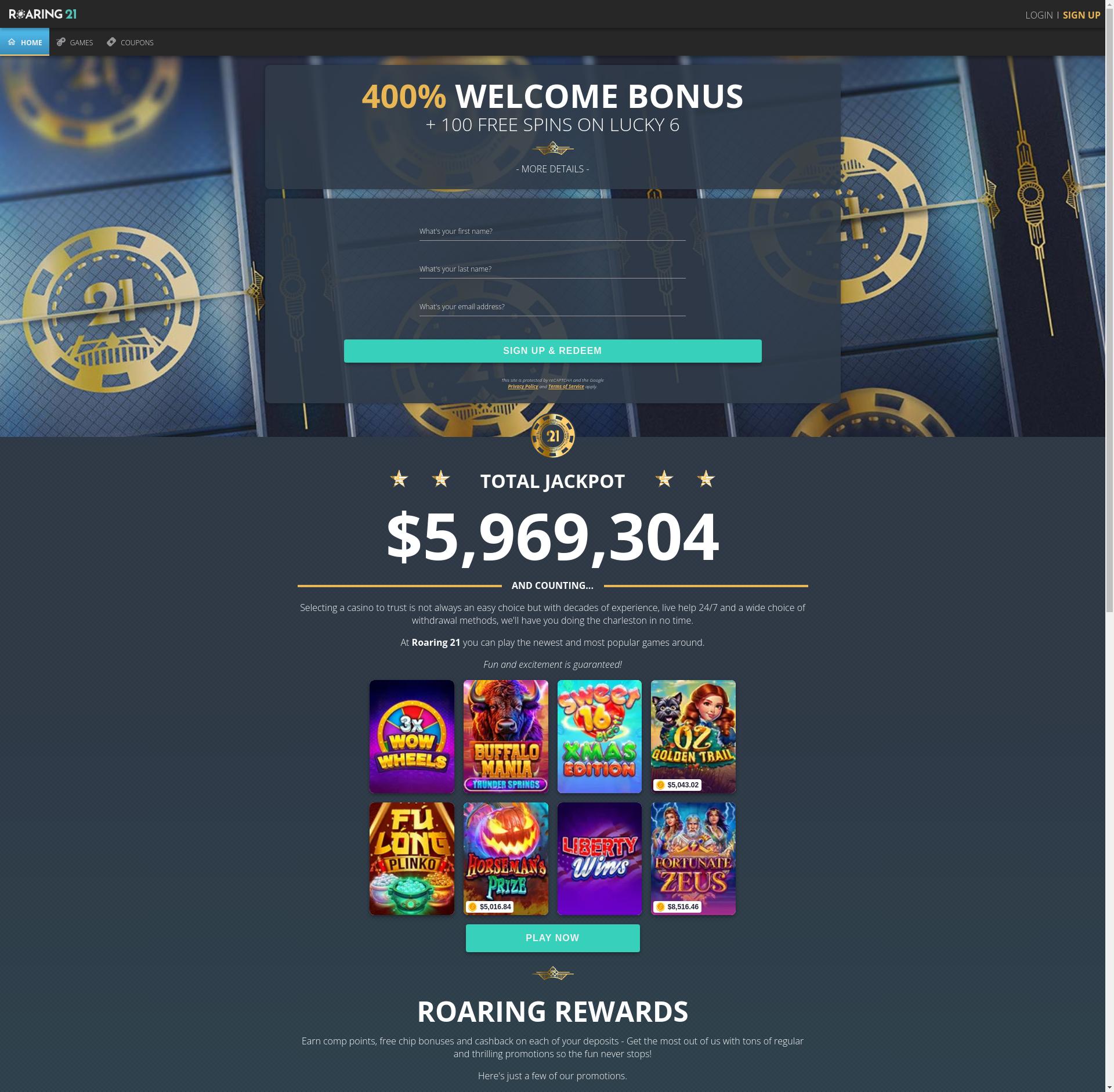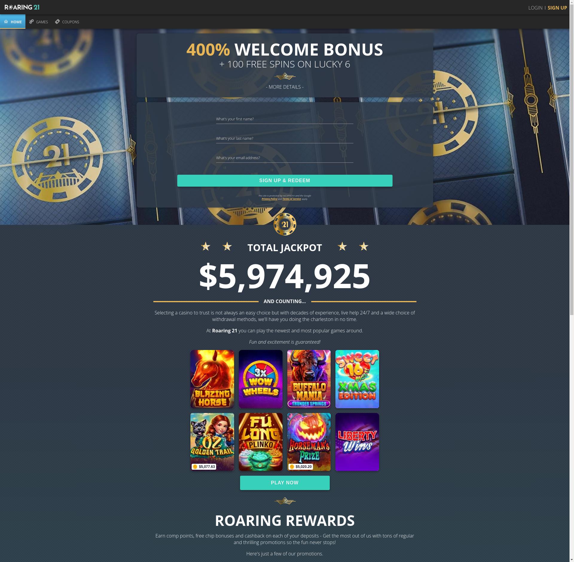 Hrajte 200 automatové hry od 2 poskytovatelů her v Roaring 21 kasinu. Přečtěte si naši recenzi Roaring 21, abyste se dozvěděli více o bonusech a propagačních akcích Roaring 21, bezplatných otočeních v kasinu Roaring 21 a mnohem více!