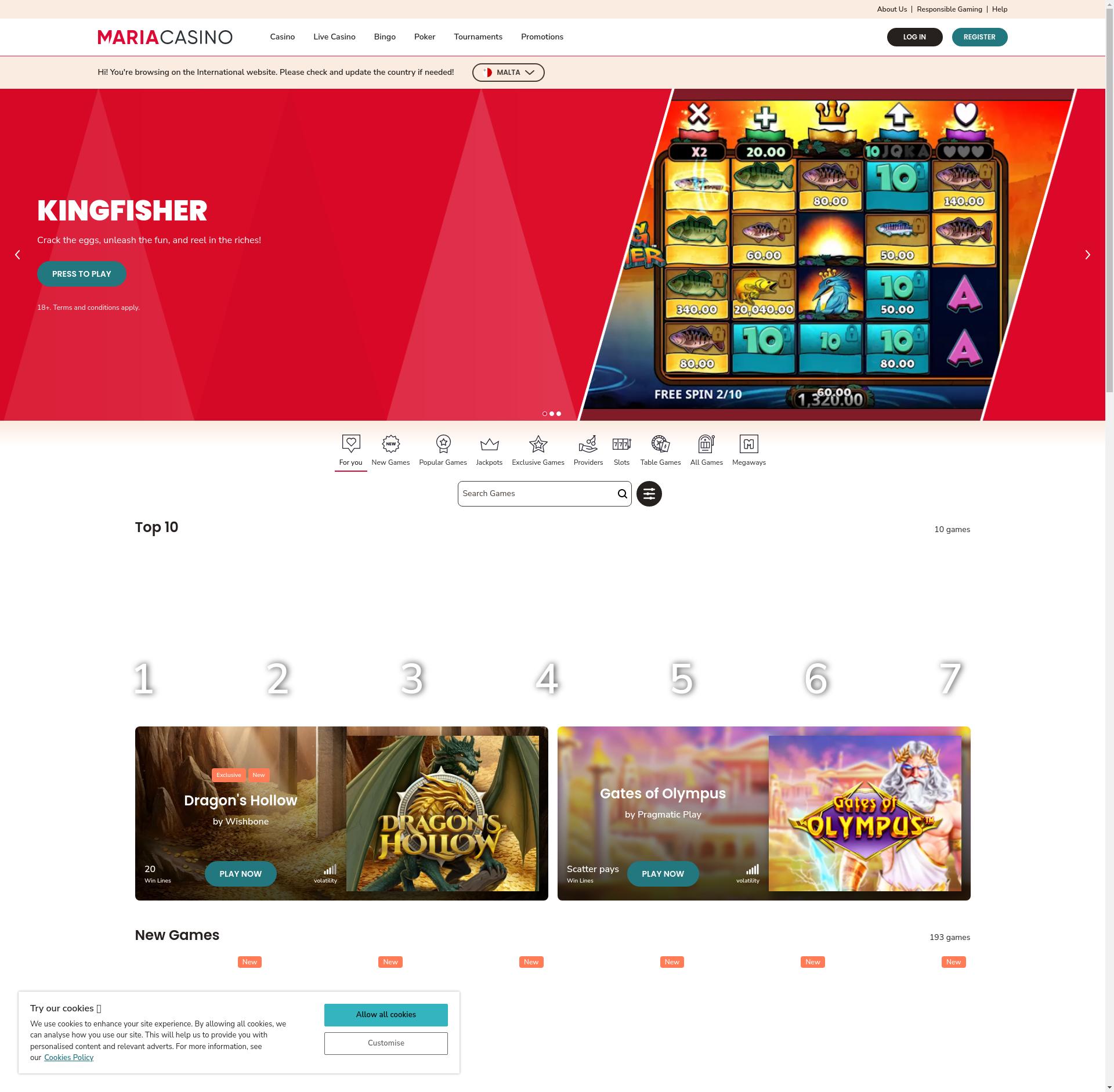Δυστυχώς, το καζίνο Maria Casino δεν δέχεται παίκτες από τη χώρα σας. Λίστα αξιόπιστων καζίνο μπορείτε να βρείτε εδώ: Τα καλύτερα διαδικτυακά καζίνο για Ελλάδα