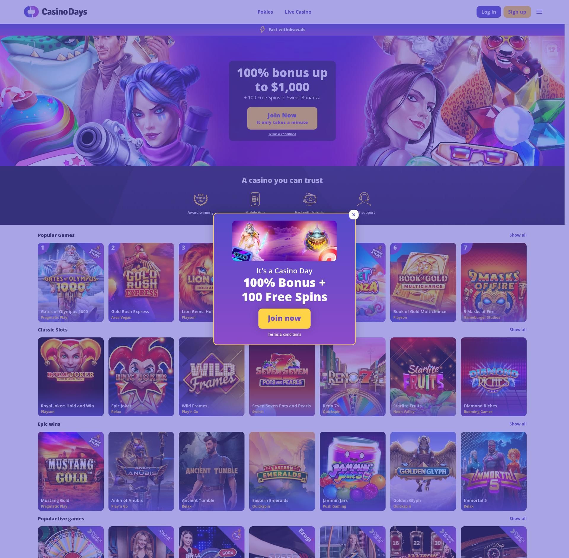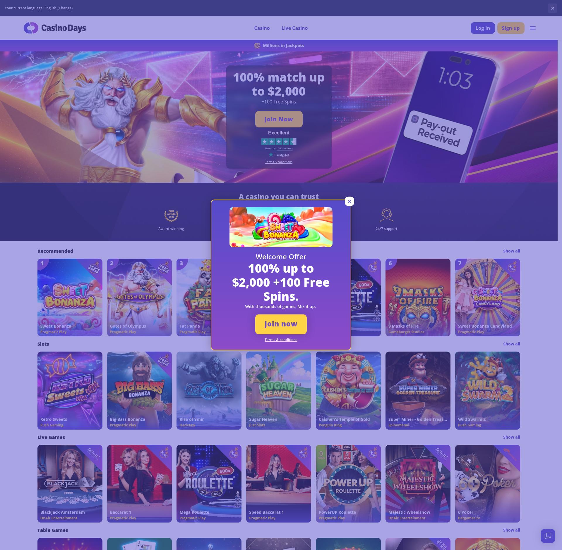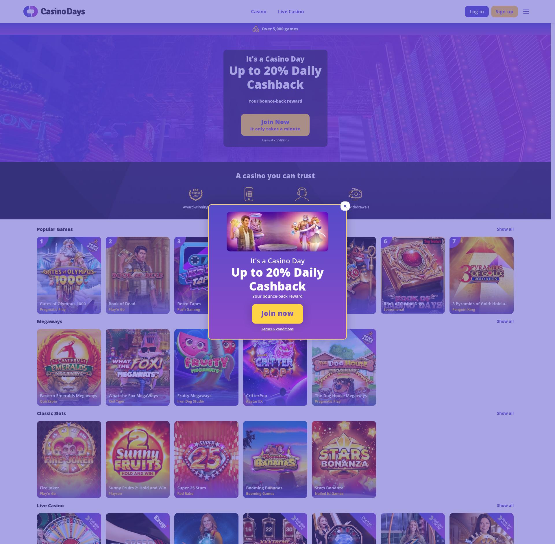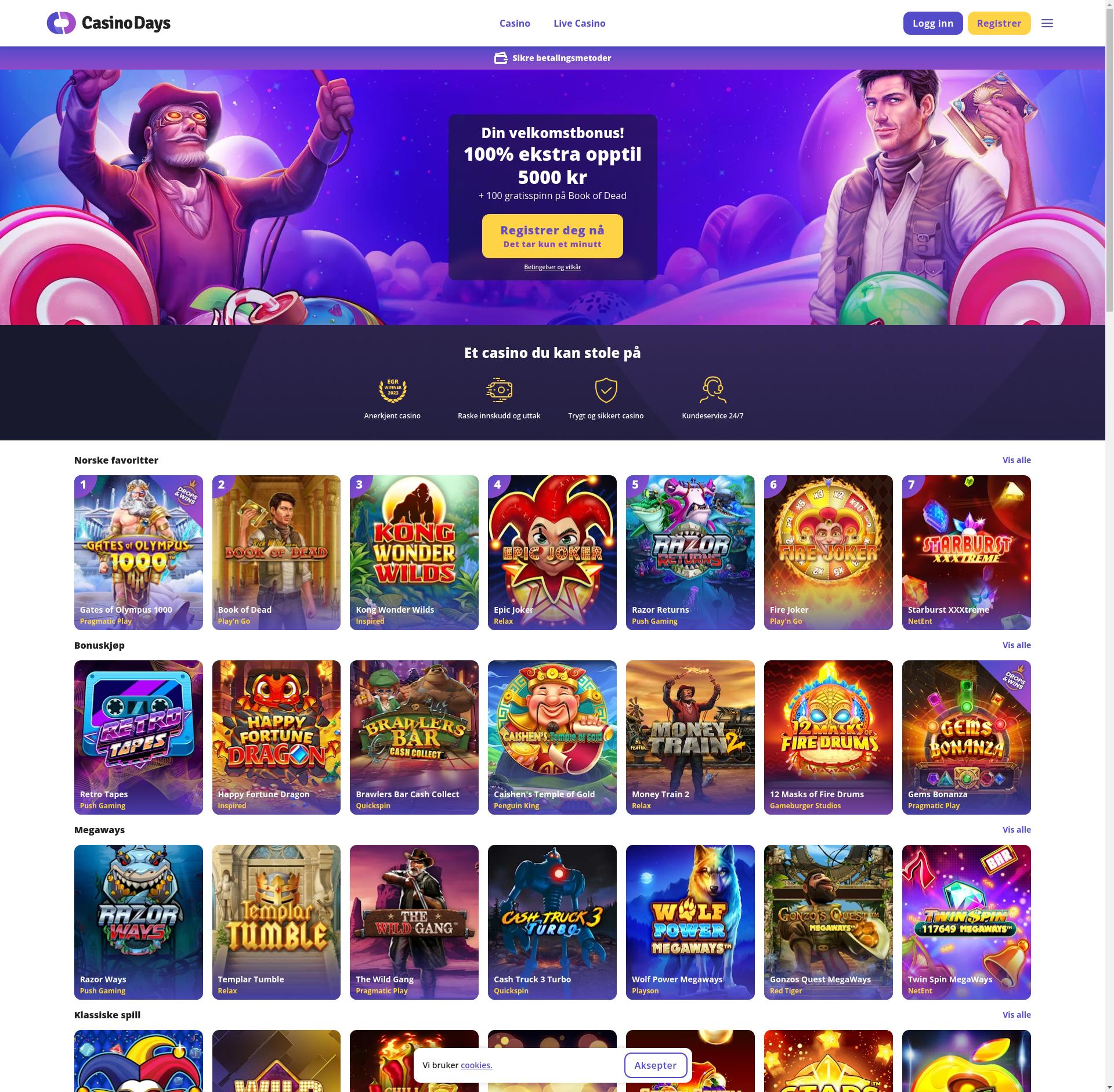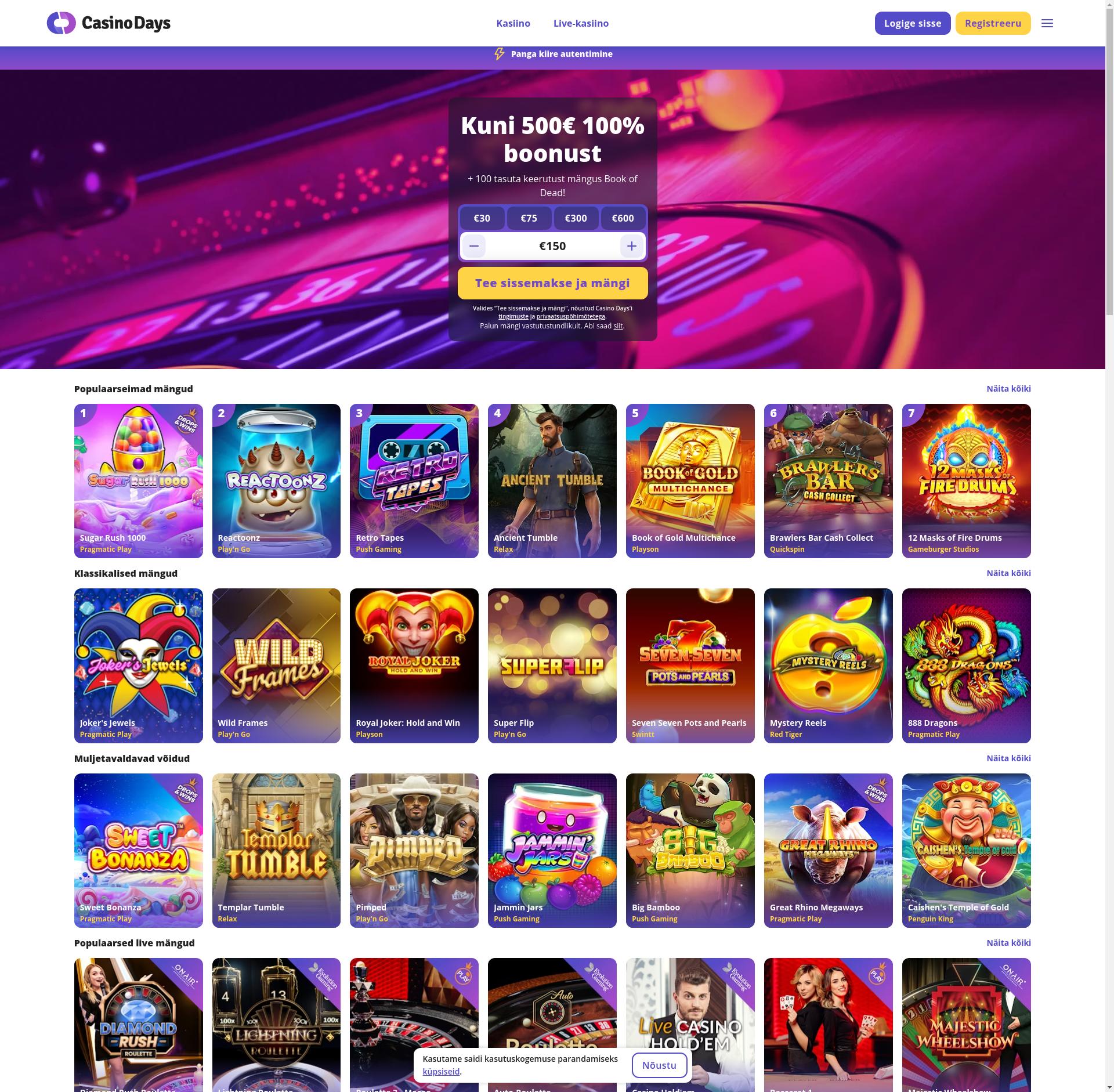 Casino Days is an online gambling website launched in 2020. The brand is owned by White Star B.V. Studios like Thunderkick and Netent provide content for the platform. Companies like Evolution Gaming provide the Live Casino section. Various payment methods are available on the website, including regular ones, like Skrill, and cryptocurrencies, like Bitcoin. You can claim various bonuses on the website, including a welcome package.