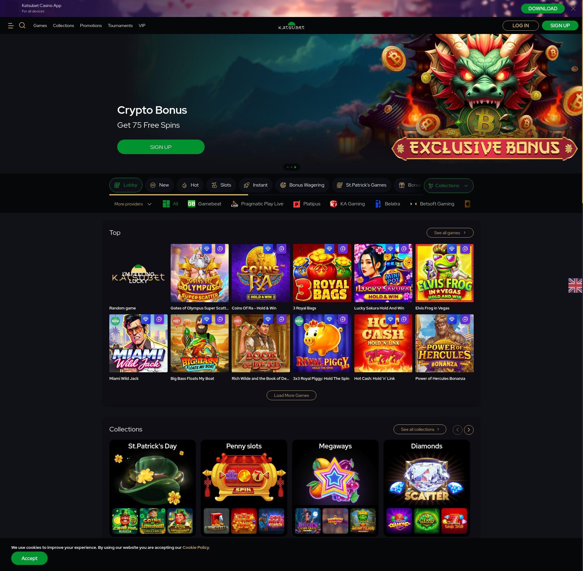 Top 8 Progressive Jackpot games on KatsuBet: Sweet Bonanza, Starlight Princess, The Dog House, Joker's Jewels, Hades: Realm of Fortune, 3x Super Peppers, Holmes and the Stolen Stones, Age of the Gods: Apollo Power