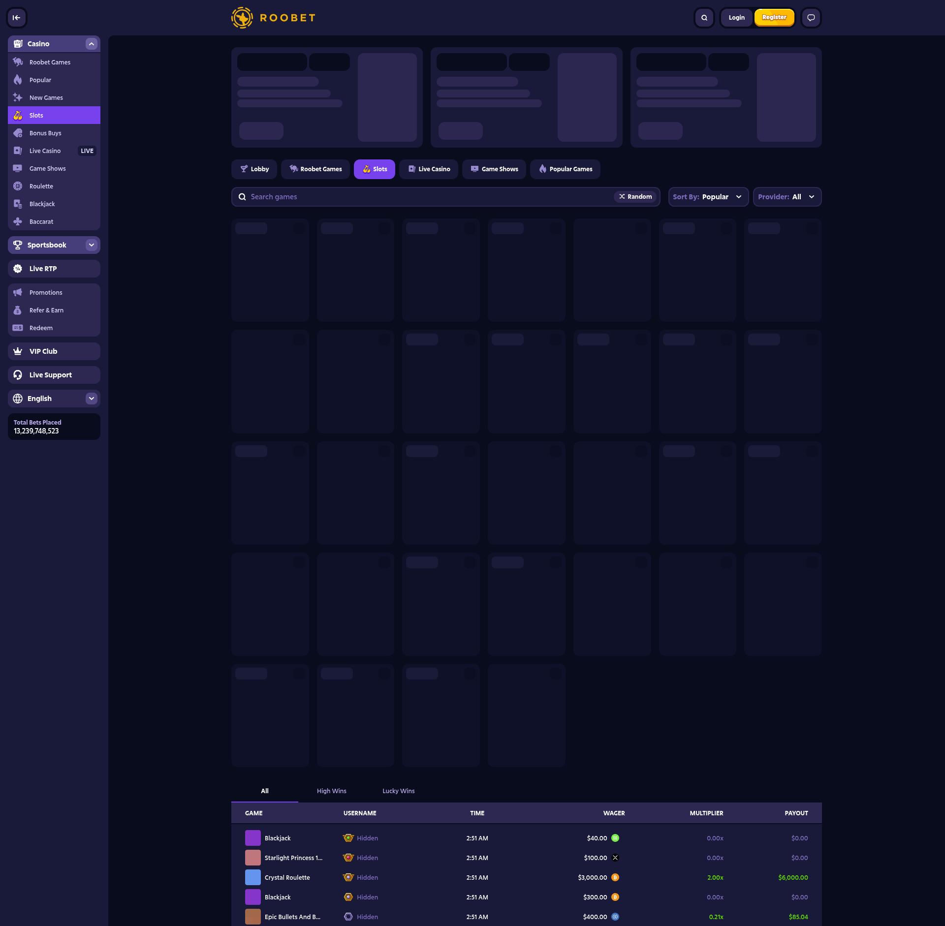 Top Roobet is the games that we have found on the highers positions of the casino`s lobby. As evidence you can check screens here. Sometimes our matching system can skip some games. Let us know in case you see difference between this list and casino screen.