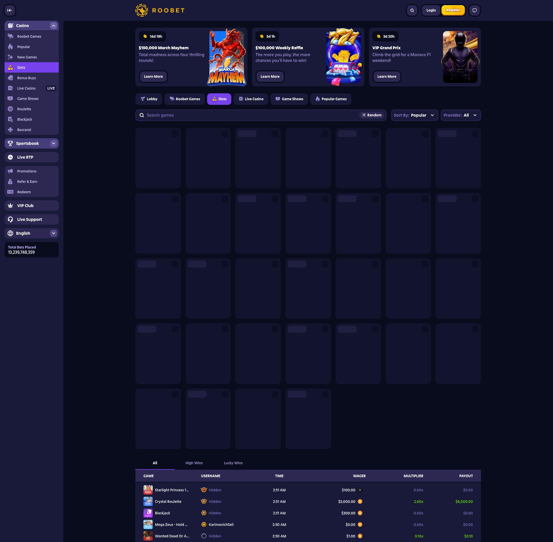 You can browse slots by the provider’s name or by sorting the content in several ways. You can also use the Search field to find particular games or studios. Overall, Roobet does not provide too many slot filters to its members. New players may need some time to navigate this huge portfolio. Here are some of the hottest slots on the platform right now: