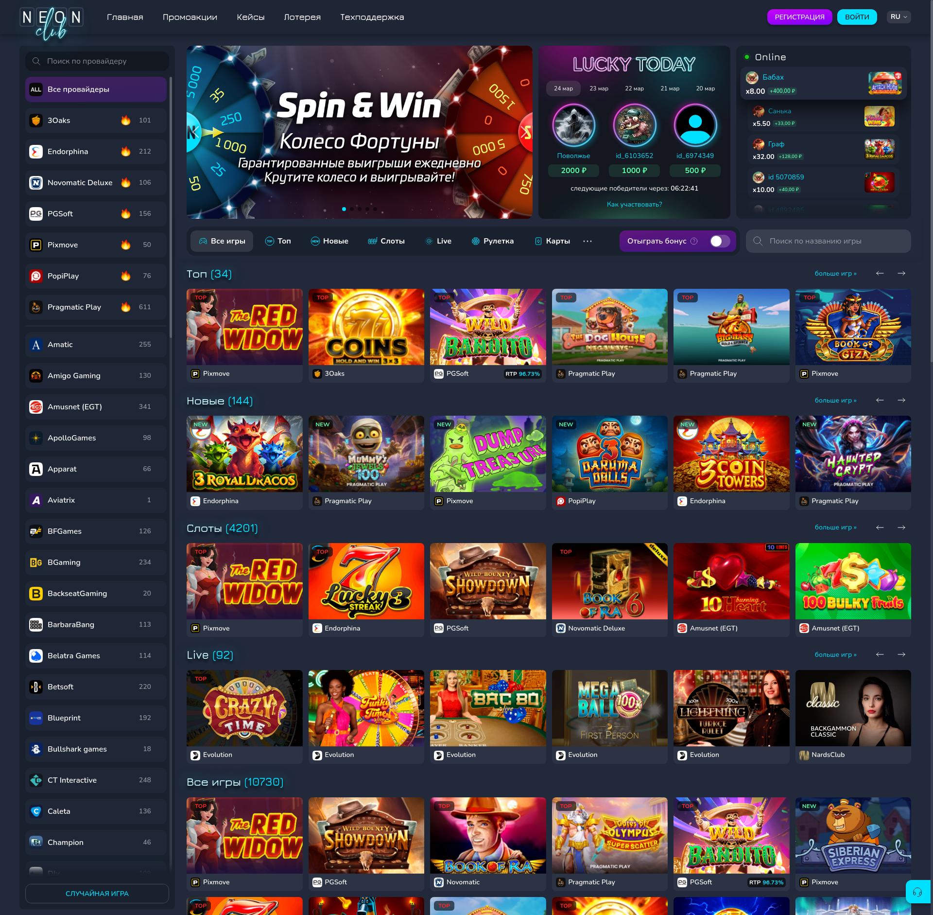 In this section you can see list of game providers that are available for your country on Neonclub.