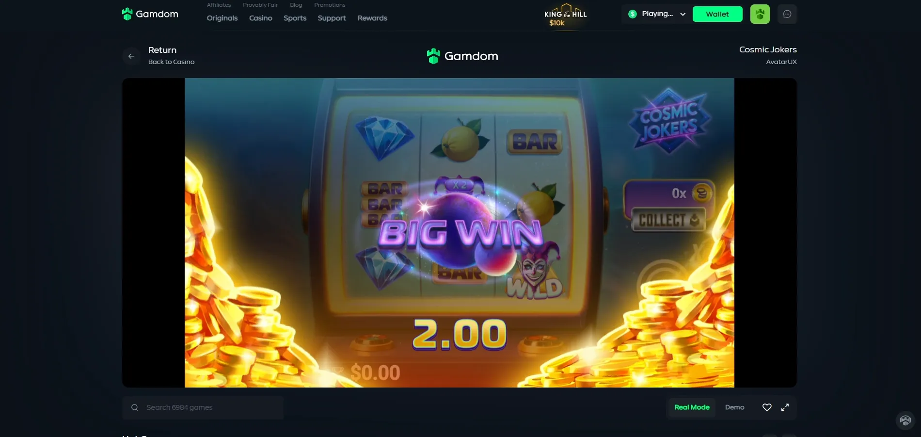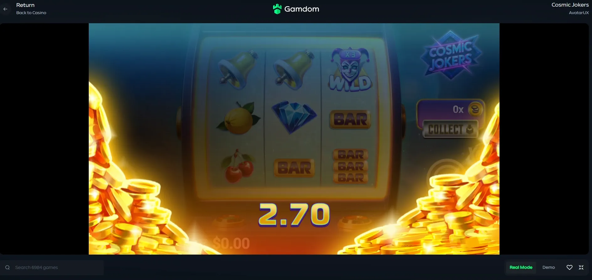 1Play any AvatarUX slot available on GamdomĀ ā including their latest releases like Captain MoreāGain, Rebel Paws, or Cosmic Jokers.