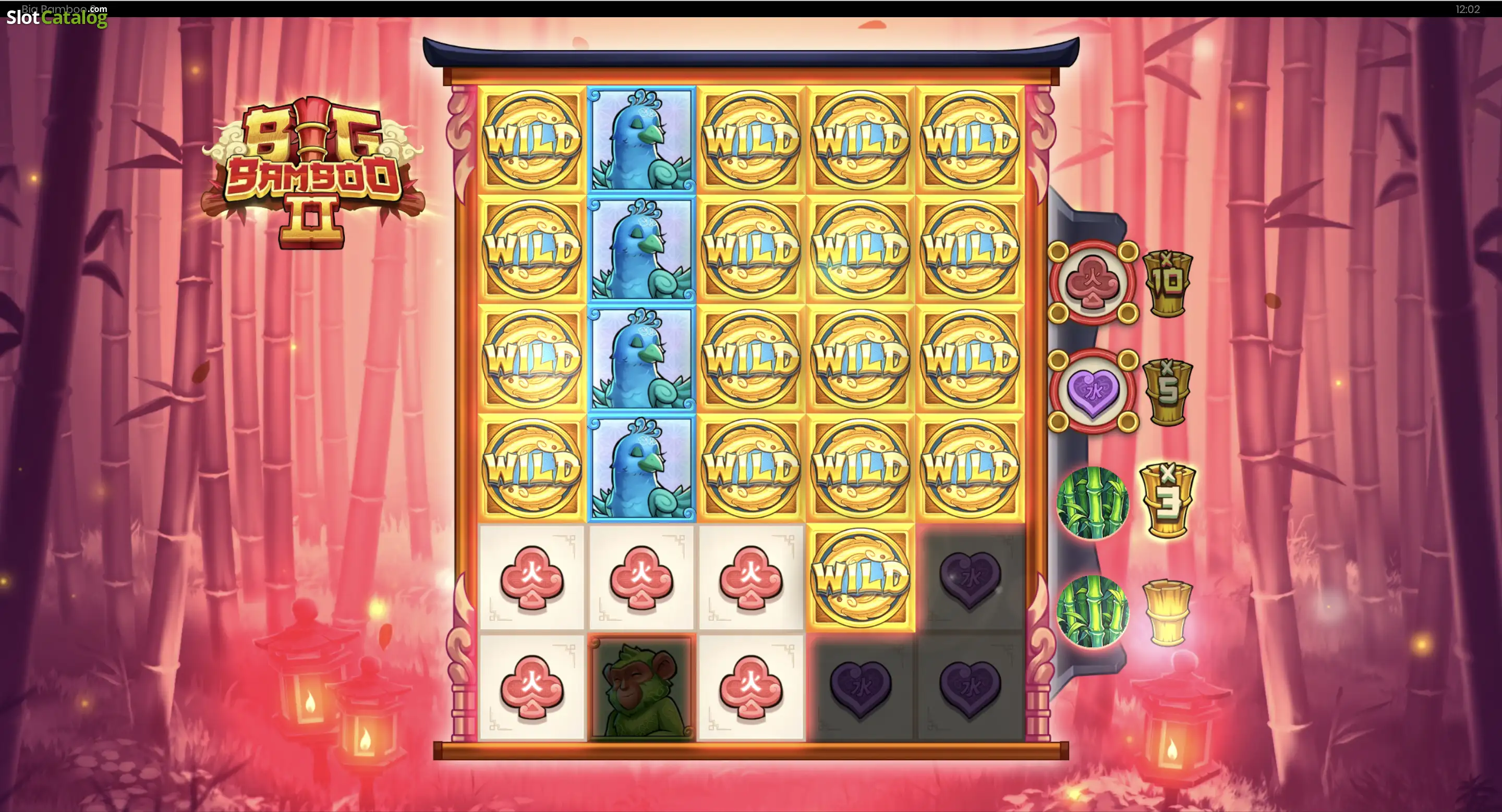 As always, we start off with the basics, and there are no changes in that regard. Big Bamboo 2 returns to the same 5x6 reel layout with 50 fixed paylines, and the symbol set will feel instantly familiar if you’ve played the original. The low tier is made up of four card suit symbols, while the premiums are the same four animal icons – parrots, monkeys, boars, and pandas. Just like before, both low and high symbols can land stacked.