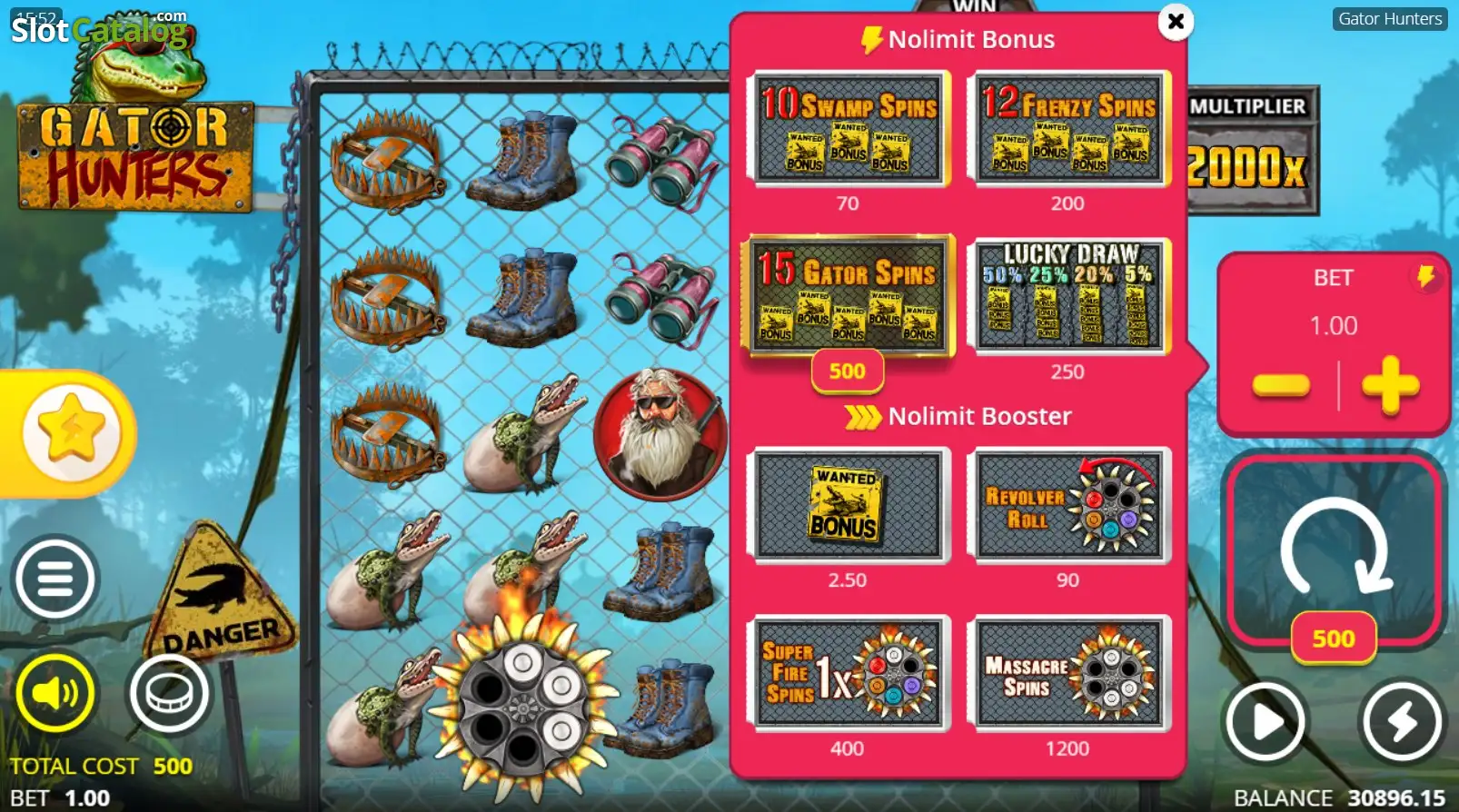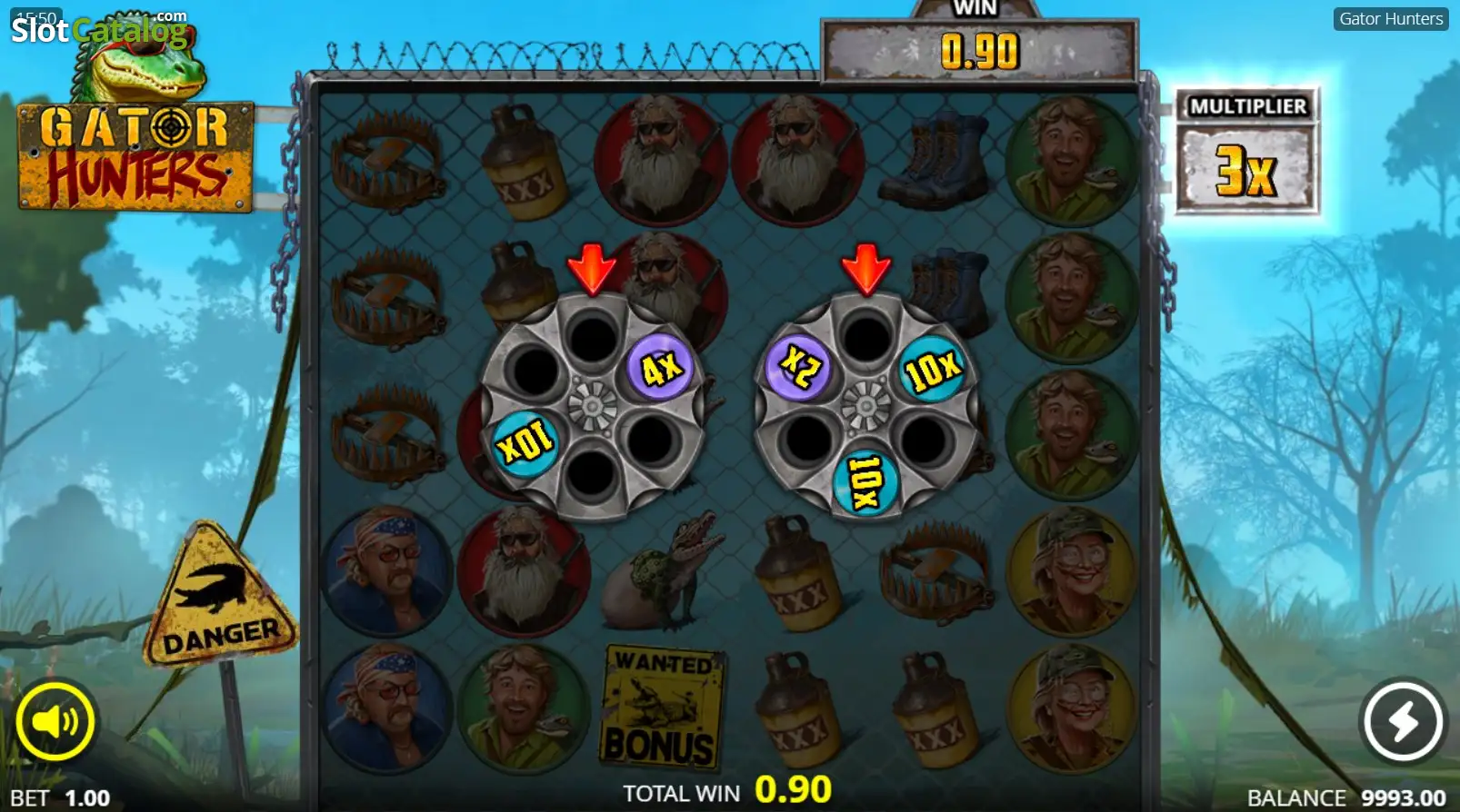 You also get the option to buy an extra spin in Gator Hunters once the round ends. The best part? All your revolvers stay on the reels, along with the total multiplier you’ve already built up – no matter what bullets they’re holding. Will the multiplier keep growing? Yes, but only if a revolver lands and fires a bullet. And the cost? That depends on your current multiplier and the revolvers you’ve got on the grid.