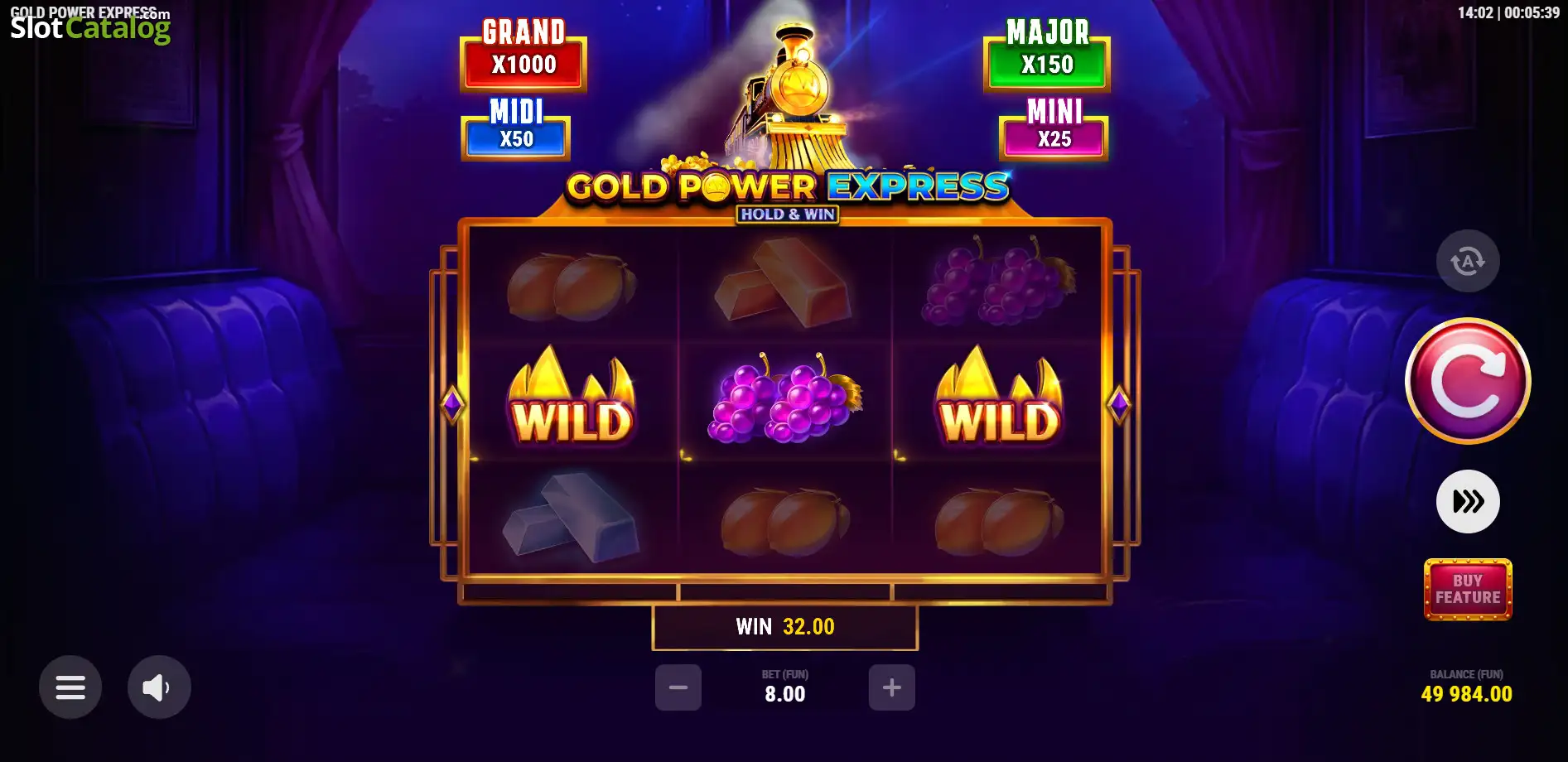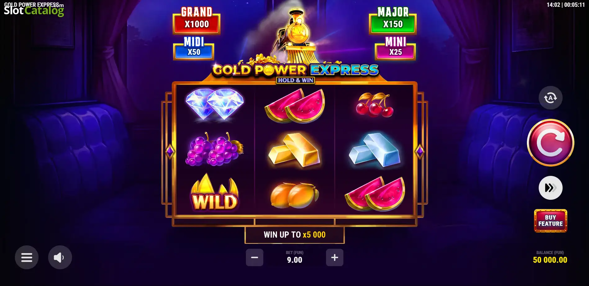 Launch the Gold Power Express demo and experience the dual-reel collector mechanic without risking real money. Test how Coins on reels 1 and 3 combine with Collectors on reel 2, explore the Hold & Win Bonus with respins and multiplier frames, and see how jackpots can grow during the feature. The demo version is the ideal way to understand the mechanics and high-volatility potential before placing real bets.