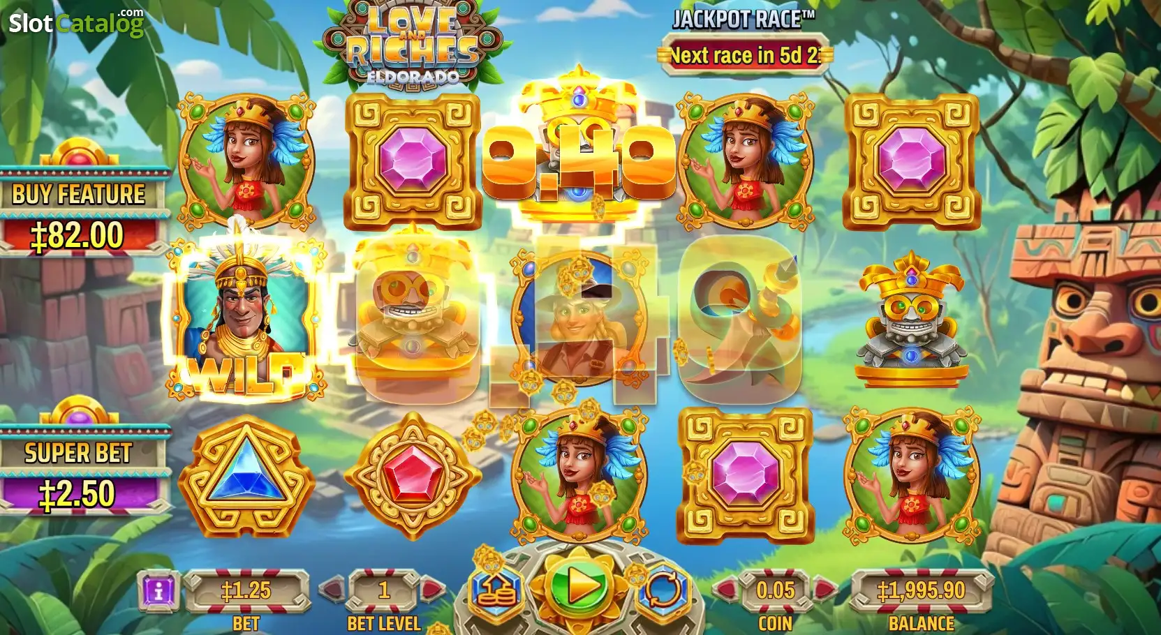 The low-value symbols are gems of different colors and shapes, awarding 0.6x and 2.40x your stake for 5 of a kind. The Aztec warrior Wild symbol can appear on reels 1, 3, and 5 only, substituting for any pay symbol to help complete or improve line wins. Eligible players will find the Super Bet feature on the left-hand side, right above the Bonus Buy option. There are no other base game features to speak of in the Love and Riches: Eldorado slot, so let’s introduce the main attraction.