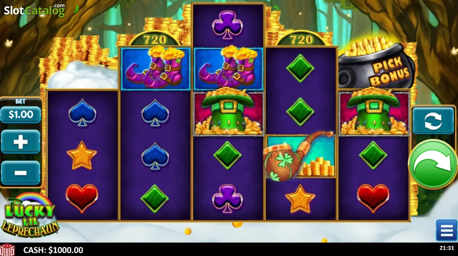 Lucky Lil' Leprechaun slot by Design Works Gaming brings high-volatility Irish luck to a unique 3-4-5-4-3 layout with 720 ways to win. Green and gold reels sparkle with leprechauns, clovers, horseshoes, rainbows, smoking pipes, butterflies, hats, shoes, and card suits under a magical forest canopy. Wilds and scatters trigger free spins loaded with multipliers and additional free spins, while the exciting pick objects bonus game and pot collection feature let you hunt for bigger treasures. Bets from 0.2 to 100 chase a solid 1000x max win with 93.93% RTP keeping the session balanced. This St. Patrick's Day adventure delivers cheerful tension as leprechauns dance, rainbows shine, clovers multiply, and every spin feels like chasing the legendary pot of gold packed with lucky surprises and rewarding payouts.