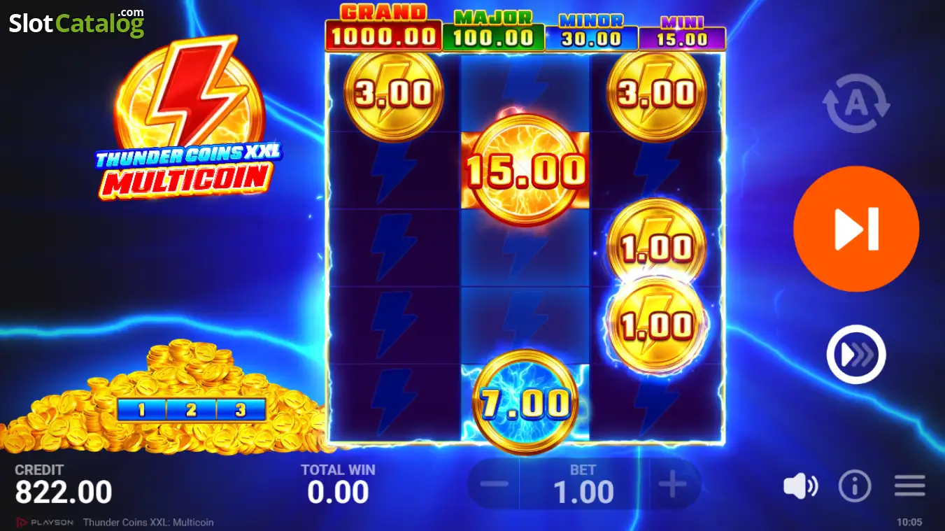 Thunder Coins XXL: Multicoin slot by Playson is an electrified classic-style slot that fuses traditional fruit machine symbols with storm-charged bonus mechanics. Built on a 3x5 reel layout with 15 fixed paylines, the game combines retro inspiration with a modern coin-collection engine designed to generate escalating rewards through multipliers and jackpot triggers. As lightning strikes and coins accumulate across the reels, each spin builds toward electrifying reward potential powered by thunderous jackpots and amplified coin wins.