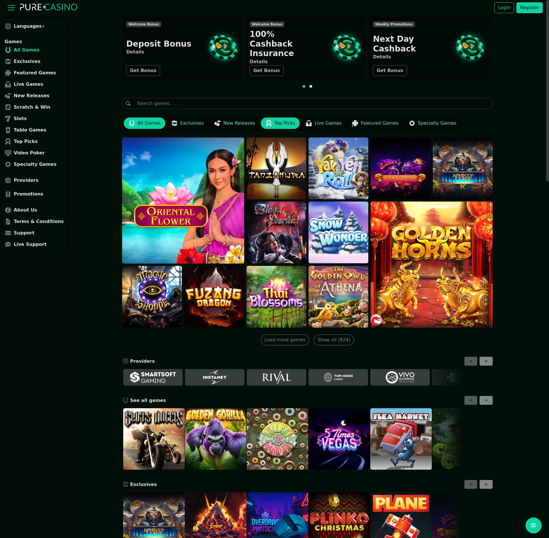 Pure Casino è stata fondata in 2019. Ha licenze da: . Prova slot emozionanti e altri giochi! Pure Casino ha oltre 625 giochi in totale, dai fornitori di giochi 29. La maggior parte dei giochi sono Video Slot. Il casinò ha anche Altri tipi e Giochi di carte.