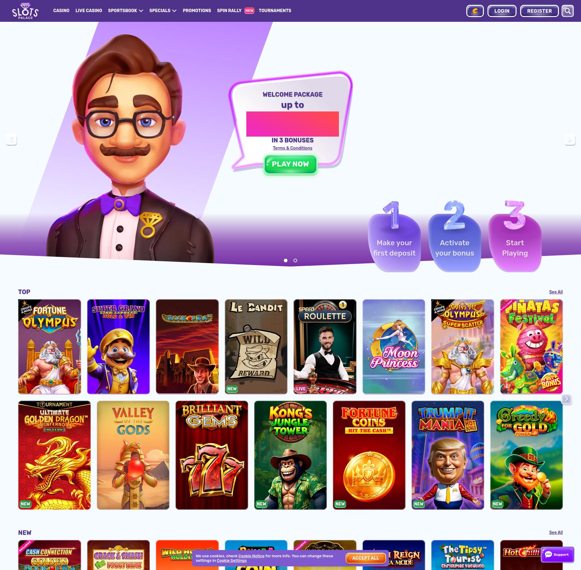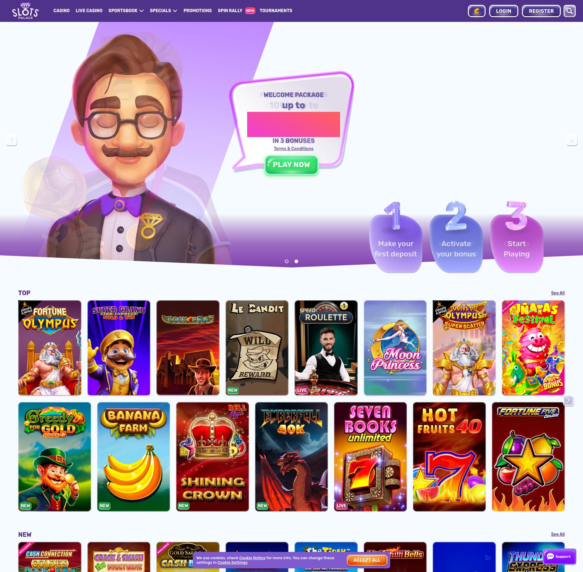 Slots Palace oferă toate cele mai populare aparate de slot, jocuri de cărți, jocuri de poker și jocuri cu dealer live.