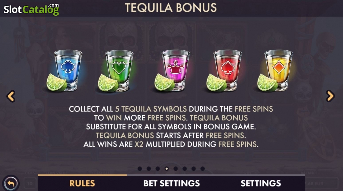 Daha fazla ücretsiz oyun kazanmak için ücretsiz oyunlar sırasında beş Tekila sembolünün tamamını toplayın. TEQUILA bonusu, dağılımlar hariç tüm sembollerin yerine geçer.